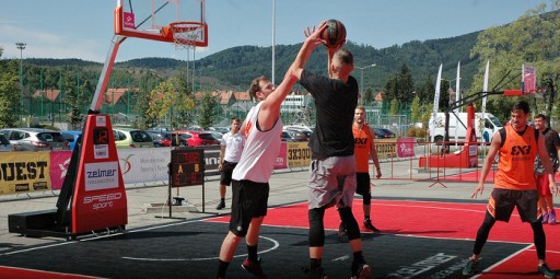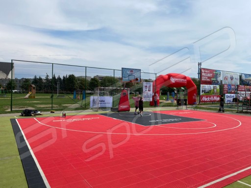Nawierzchnia HEXA POWER PRO z naniesionymi liniami boiska do koszykówki 3x3 oraz logotypami producenta jednocześnie będącymi tytułem cyklu turniejów.