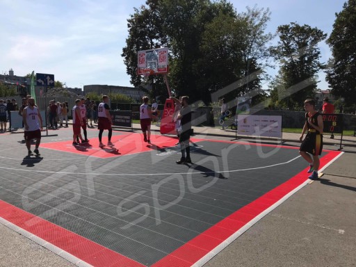 Nawierzchnia HEXA POWER PRO z naniesionymi liniami boiska do koszykówki 3x3 oraz logotypami producenta jednocześnie będącymi tytułem cyklu turniejów.