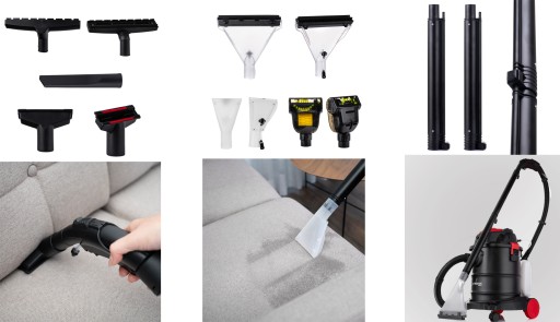 Zapomnij o dodatkowych wydatkach! W zestawie odkurzacz posiada zarówno szeroką ssawkę piorącą do dywanów jak i wąską ssawkę do tapicerek, a system do ekstrakcji został wygodnie zintegrowany z rurami i wężem.