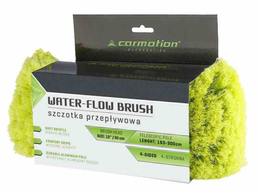 Szczotka przepływowa z miękkim włosiem, posiada wygodne uchwyty i wytrzymały aluminiowy drążek. Drążek teleskopowy wykonany jest z wytrzymałego aluminium z miękkimi uchwytami, posiada złączkę wodną z zaworem odcinającym. Szczotka nie rysuje lakieru dzięki specjalnemu miekkiemu włosiu. Specjalna 4-stronna i duża szczotka umożliwia bardzo efektywne i skuteczne mycie.