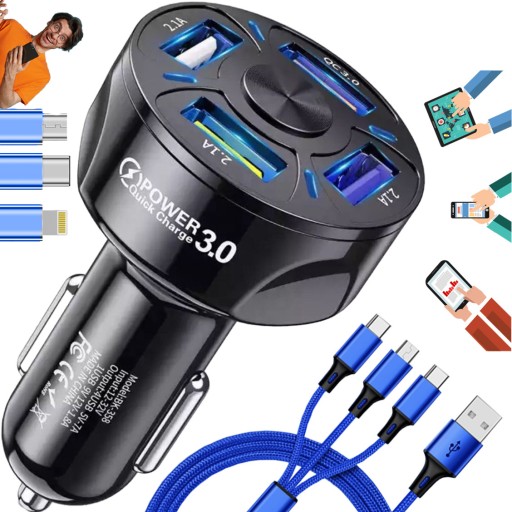 АВТОМОБИЛЬНОЕ ЗАРЯДНОЕ УСТРОЙСТВО USB FAST LIGHTER 4X USB-НАБОР С КАБЕЛЕМ USB-C