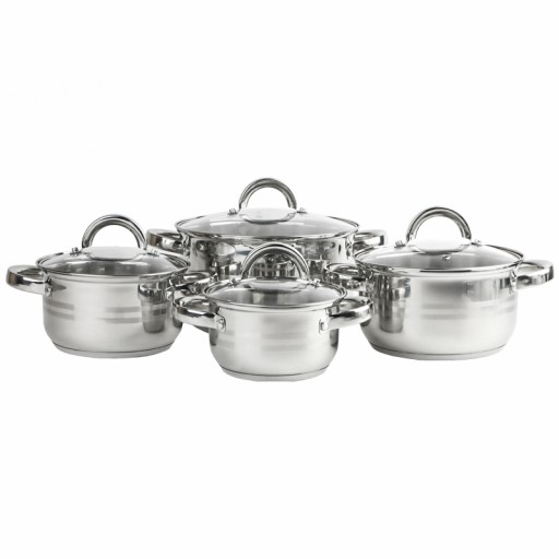 Komplet garnków wykonany z wysokiej jakości stali nierdzewnej. Energooszczędna technologia pomagająca zaoszczędzić pieniądze i czas. Garnki są odporne na zużycie nawet po długim okresie użytkowania. Każdy z garnków posiada uchwyt odporny na ciepło. Pokrywy wykonane są z najwyższej jakości szkła hartowanego. Cały zestaw nadaje się do wszystkich rodzajów kuchenek