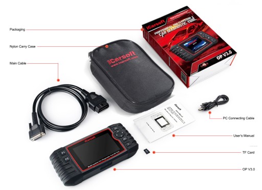 iCarsoft OP V3.0 oferuje funkcje OBDII dla wszystkich samochodów obsługujących ten standard, nie tylko dla Opel i Vauxhall. Umożliwia to czytanie i kasowanie kodów błędów, testy gotowości I/M, testy czujnika O2 i wiele innych.