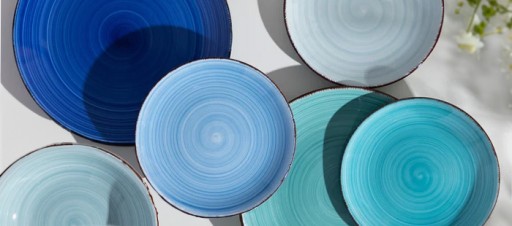 Wszystkie talerze tworzą spójną paletę barw w odcieniach niebieskiego - jaśniejszych, ciemniejszych, wpadających w zieleń, szary lub granat.