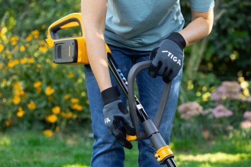 GT 300e posiada wygodny przełącznik, który umieszczono na rączce, aby zapewnić operatorowi pełną kontrolę i bezpieczeństwo. Urządzenie jest również niebywale lekkie i poręczne, co zwiększa komfort pracy i umożliwia precyzyjne prowadzenie. Dopełnieniem wygody użytkowania jest w pełni regulowany uchwyt w kształcie pętli, który w efekcie umożliwia bezproblemowe manewrowanie podkaszarką. Dodatkowym atutem jest możliwość dopasowania wałka teleskopowego do wzrostu operatora. Mocny silnik oraz idealne wyważenie akumulatora sprawiają, że praca tą podkaszarką z pewnością jest wygodna.