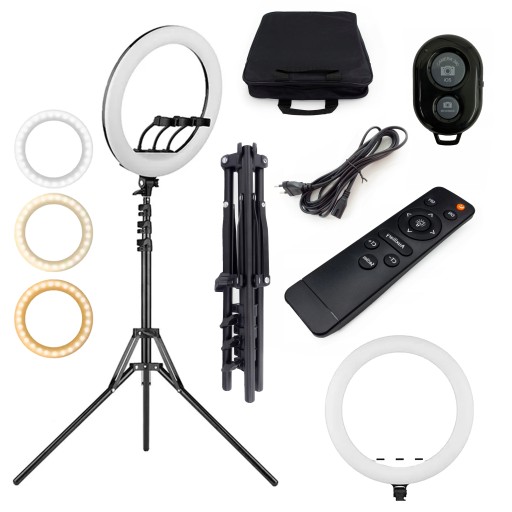 ⭐️ W skład zestawu lampy pierścieniowej LED wchodzi praktyczna torba, która znacząco ułatwia przechowywanie i przenoszenie lampy. Solidny statyw stanowi kluczowy element zestawu, umożliwiający stabilne ustawienie lampy w odpowiedniej wysokości. Dzięki pilocie użytkownik płynnie reguluje jasność oświetlenia oraz dostosowuje temperaturę barwową, bez konieczności przerywania pracy.