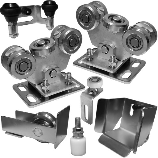 Wózki 5-rolkowe do bramy przesuwnej 80x80x5 mm. Wybrany komplet wózków charakteryzuje się podwyższoną wytrzymałości z podwójną regulacją. Wózki bramowe dzięki wahliwej podstawie dopasowują się do szyny 80x80. Każdy z elementów stalowych jest ocynkowany, co sprawia, że elementy posiadają możliwie najlepsze zabezpieczenie antykorozyjne odporne na warunki atmosferyczne. Wózek do bramy składa się z 5 metalowych rolek. Każda rolka jest łożyskowana. Cały zestaw wózków do bram dzięki wysokiej jakości materiałów użytych przy produkcji zapewnia pracę bramy na lata. Precyzja wykonania zapewnia cichą i płynną prace. Montaż wózków jest możliwy dzięki płycie montażowej która posiada 4 fasolkowe otwory.
