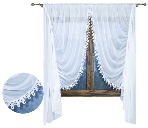 - Materiał: Firanki zostały wykonane z delikatnego, lecz trwałego materiału typu woal, który zapewnia przyjemny dotyk i estetyczny wygląd. Główną ozdobą są eleganckie wykończenia gipiurą, które dodają im wyjątkowego charakteru..