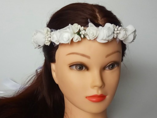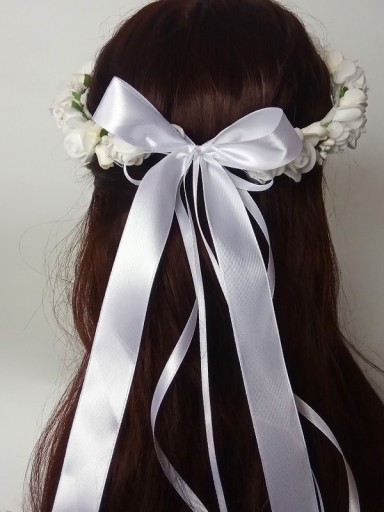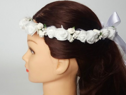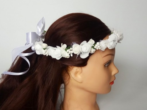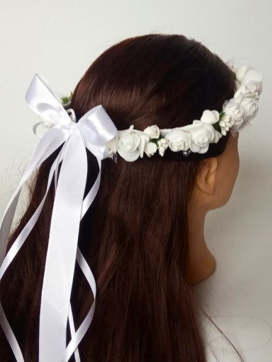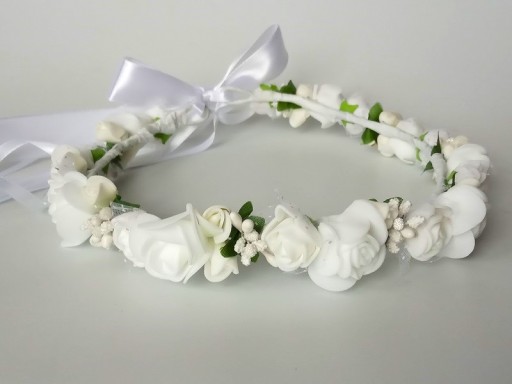 - Wianek wykonany jest z białych piankowych różyczek, białych dodatków, zielonych listków i wstążki.