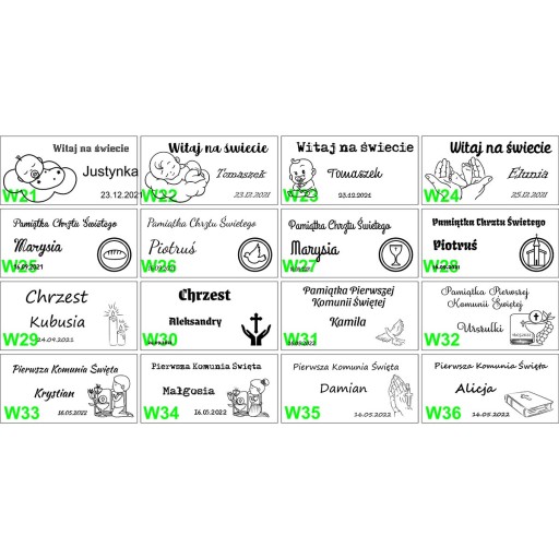 Do wyboru jest wiele gotowych wzorów dzięki czemu możesz dopasować pudełko tak, aby było idealne do okazji i osoby, którą chcesz obdarować. Możesz wzory oraz czcionki mieszać ze sobą i łączyć. Np.: Wzór W3 z czcionką W5. Możesz również zaproponować własny wzór i grafikę.
