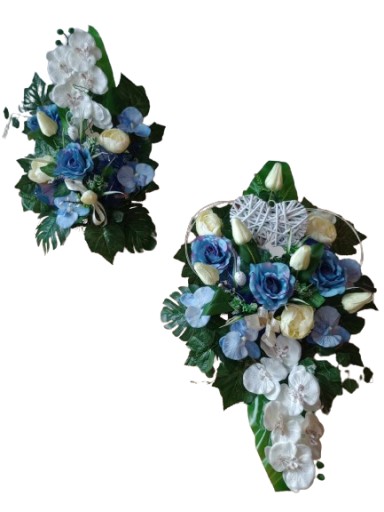 Kompozycja sztuczna (tzw. stroik, ikebana) jest wykonana z sztucznej choiny w doniczce plastikowej co daje jej stabilność.