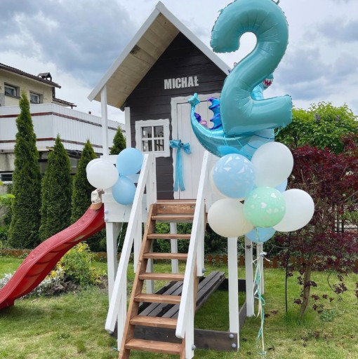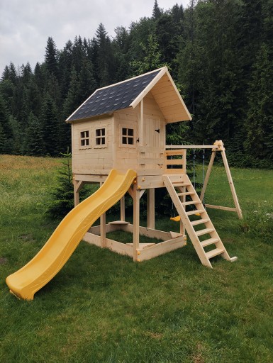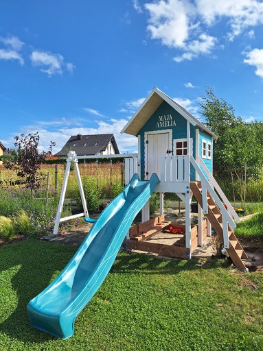 Piękny i nowoczesny domek do zabaw w ogrodzie. W zestawie domek na podeście, zjeżdżalnia, huśtawki i piaskownica czyli wiele frajdy dla Twojego dziecka.