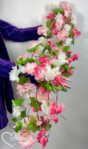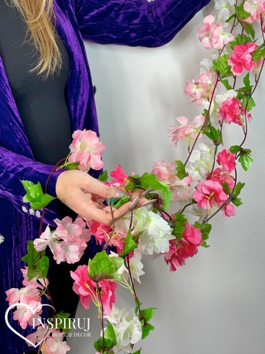 Girlanda z kwiatów wiśni wykonana została z tworzywa sztucznego. Materiałowe kwiaty wiśni oraz listki osadzone są naprzemiennie na pikach. Zwisające luźno kwiatostany róż dopełniają całości i nadają kompozycji stylu oraz lekkości. Doskonale sprawdza się w dekorowaniu każdego wnętrza - w domu, restauracjach, hotelach, biurowcach, szkołach, sklepach czy na eventy tematyczne. Wspaniałe rozwiązanie w dekoracji balkonu, tarasu, czy ogrodu.