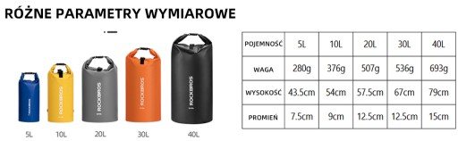 Różne rozmiary do wyboru. Posiadamy 2 L/5 L/10 L/20 L/30 L/40 L łącznie 6 rozmiarów. Niezależnie od tego, jaki rozmiar chcesz, worki ROCKBROS'a mogą z nimi poradzić.