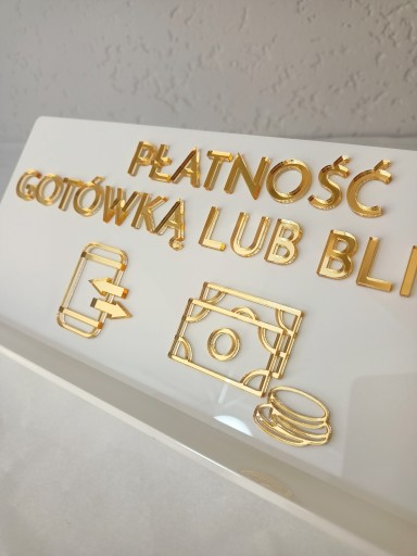 Akrylowa Tabliczka Stojaczek PŁATNOŚĆ GOTÓWKĄ LUB BLIKIEM z lustrzanymi napisami i piktogramami.