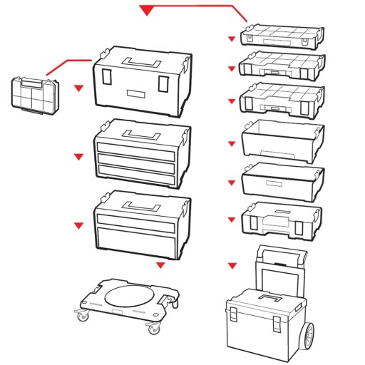Poliamidowe konektory boczne pozwalają na łatwe łączenie z pozostałymi modułami z linii PRO oraz ONE (z pokrywami Vario oraz Adapterem Multi). Wygodna rączka zapewnia komfort przenoszenia narzędzi. Identyfikację zawartości zapewnia miejsce na etykietę zabezpieczone poliwęglanową nakładką. Automatyczny system blokowania szuflad przed wysuwaniem gwarantuje wysoki komfort użytkowania skrzyni.
