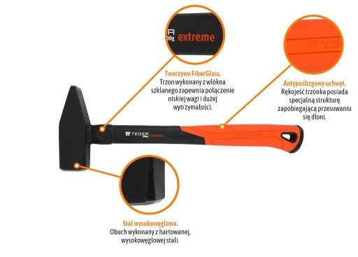 Młotek ślusarski z trzonkiem fiberglass 2000 g Extreme / TEGER przeznaczony do podstawowych prac ślusarskich, wbijanie, pobijanie, podkuwanie. Obuch wykonany z wysokogatunkowej, hartowanej stali węglowej, połączony z ergonomicznym trzonkiem z włókna szklanego zadba o jakość i ergonomię pracy zarówno profesjonalistów jak i domowych majsterkowiczów.