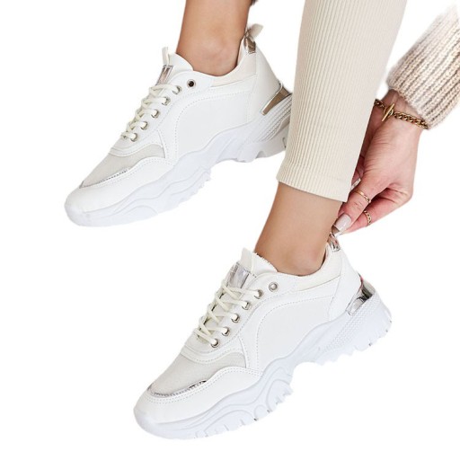 Sportowe sneakersy damskie wykonane z eko-skóry. W środku tkaninowa wkładka. Model jest sznurowany, na masywnej podeszwie ze srebrną wstawką z tyłu. Będą świetną ozdobą do codziennych stylizacji.