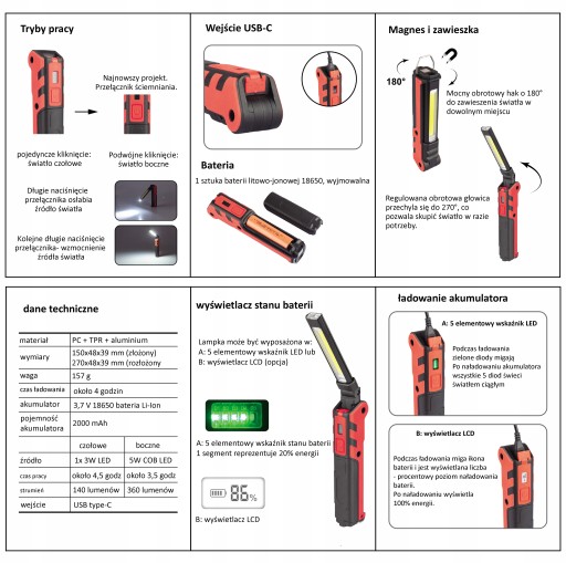MOCNA LAMPKA ROBOCZA LED LATARKA WARSZTATOWA LAMPA Z MAGNESEM USB VERKE