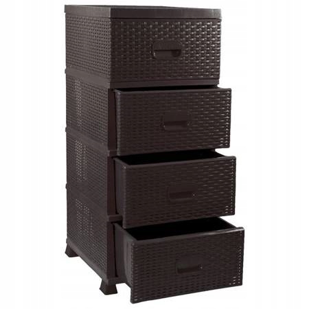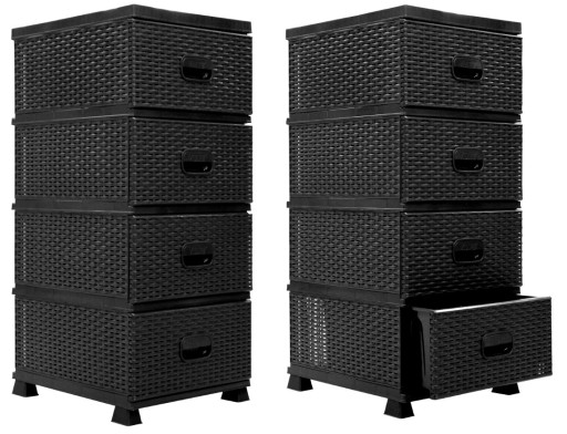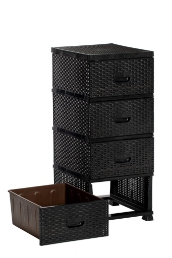 Parametry produktu: - Materiał: tworzywo sztuczne - Kolor: czarna rattan - Liczba szuflad: 4 - Wymiary: 38x45x90cm