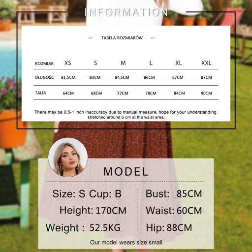 Cechy: wysoka talia, elastyczny pas, dwie kieszenie, plisowane, linia A, polka dot, maxi skrit, midi skrit. Kieszenie po obu stronach dla wygodnego i praktycznego użytkowania. Możesz umieścić w nich małe rzeczy, takie jak klucze do telefonu komórkowego. Wysokoelastyczna plisowana talia i eleganckie obszycie dla różnych ciał.