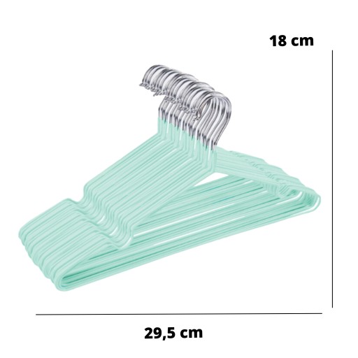 Zestaw 20 szt. wieszaków w kolorze miętowym, idealnie dopełnią kolorem szafę Twojego dziecka! Pokryte powłoką PVC zabezpieczą ubranka przed zsuwaniem się, a zaokrąglone ramiona sprawią, że nie będą się odkształcać. Wykonane z wytrzymałego i cienkiego materiału co pozwoli na zaoszczędzenie miejsca w szafie! Dzięki specjalnym wycięciom, bez problemu zawiesisz koszulki na ramiączka oraz sukienki.