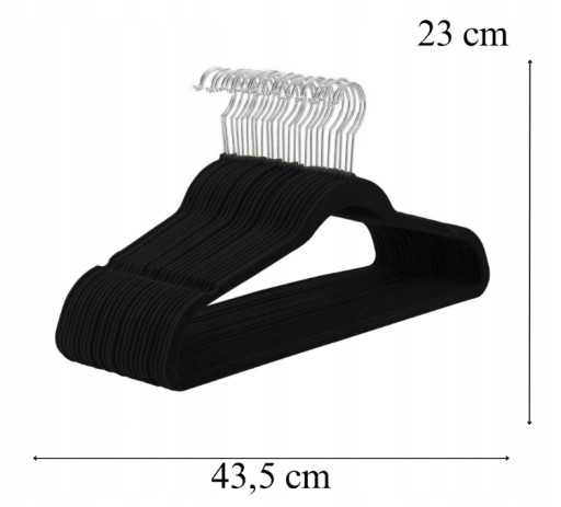 Zestaw 40 szt. wieszaków w kolorze czarnym, pokryte aksamitnym welurem zabezpieczą Twoje ubrania przed zsuwaniem się, zaokrąglone ramiona spowodują, że ubrania nie będą się odkształcać. Wieszaki posiadają specjalne wycięcia do zawieszania bluzek/topów na ramiączka. Wykonane z wytrzymałego i cienkiego materiału co pozwoli na zaoszczędzenie miejsca w Twojej szafie! Powiesisz na nich koszule, spodnie, bluzy, kurtki itp.
