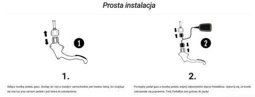 Instalacja PedalBox odbywa się w kilku krokach: dwie oryginalne wtyczki PedalBox podłącza się do elektronicznego pedału przyspieszenia w pojeździe. Po instalacji PedalBox jest od razu gotowy do użycia. Dzięki dostarczonemu wspornikowi PedalBox jest zawsze umieszczony w zasięgu kierowcy. Dzięki dołączonym podkładkom samoprzylepnym PedalBox można łatwo zamocować i np. przy zmianie pojazdu ponownie zdjąć bez pozostawiania śladów. Dzięki dostrojeniu pedału przyspieszenia radość z jazdy jest dostępna tylko po naciśnięciu przycisku.