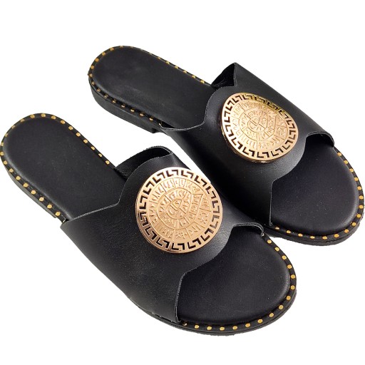 Komfortowe klapki damskie na miękkiej elastycznej podeszwie. Dzięki funkcjonalnemu krojowi doskonale trzymają się na stopie. Eleganckie, przyciągające wzrok detale - połyskujące złote dżety i wyrazista złota ozdoba. Prosty, gustowny fason.