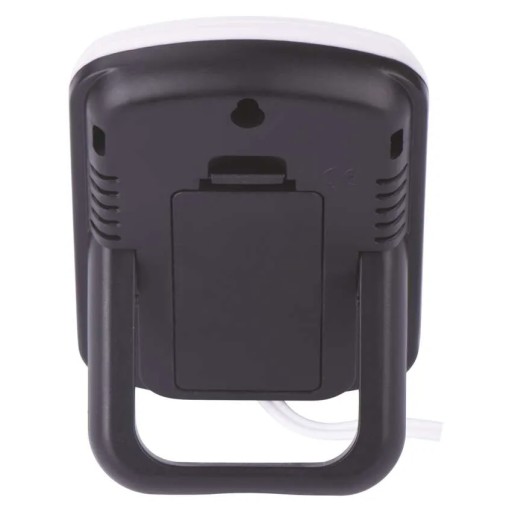 Termometr przewodowy z wyświetlaniem temperatury wewnętrznej i zewnętrznej. Termometr ma sondę przewodową o długości 2 m.