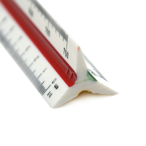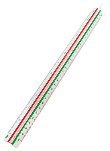 Skalówka Urbanista z białego tworzywa. Produkt posiada nadrukowane 6 precyzyjnych skal: 1:20/25/50/100/200/500.