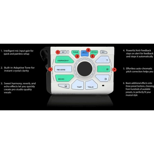Perform-VK to procesor wokalny zaprojektowany specjalnie do współpracy z klawiszowcem. Złącza MIDI oraz stereofoniczne złącze audio pozwalają na bezbolesną konfigurację Perform-VK z Twoim sprzętem, zapewniając Ci wybór najlepszej metody na prowadzenie tonacji i harmonii wokalnych za pomocą tego procesora. To bardzo przydatna cecha, ale jest ona tylko wisienką na torcie, którego podstawowymi składnikami są doskonałe efekty Reverb, Echo, Harmony oraz układ Adaptive Tone – automatycznej EQ, de-essera, bramki szumów i kompresji. Perform-VK to nie tylko zwykły procesor dźwięku – to rozbudowana platforma, która pełnię możliwości osiągnie jeśli tylko zaangażujesz w jej obsługę urządzenia z których korzystasz na co dzień – czyli smartfon i komputer osobisty. Dzięki darmowej aplikacji Perform-VK dostępnej na Android oraz iOS, możesz rozszerzyć bibliotekę efektów o Doubling, Megaphone, HardTune oraz szereg efektów modulacyjnych, takich jak Chorus czy Flanger, ukrytych pod zestawem efektów zwanym μMOD (mikroMOD). Doskonałym uzupełnieniem oraz przydatnym narzędziem będzie także aplikacja na komputer VoiceSupport, za pomocą której dokonasz aktualizacji Perform-VK, pobierzesz presety lub po prostu zapiszesz swoje własne ustawienia. Perform-VK jest niezwykle prosty w obsłudze dzięki dużym, podświetlanym przyciskom oraz centralnemu pokrętłu Control Knob, dzięki któremu łatwo ustawić wybrane parametry, co dodatkowo wskazuje czterokolorowy pierścień z diod LED. Perform-VK wyposażony jest także w złącze MIDI, zasilanie phantom, układ przeciwsprzężeniowy, wbudowany mikrofon wspomagający RoomSense, Tap Tempo oraz ma możliwość sterowania przez opcjonalny mikrofon MP-75, MP-76 lub podłogowy footswitch Switch-3/Switch-6. Najważniejsze cechy: