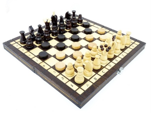 Ciemne warcaby pokryto czarną bejcą, a jasne mają naturalny odcień drewna.