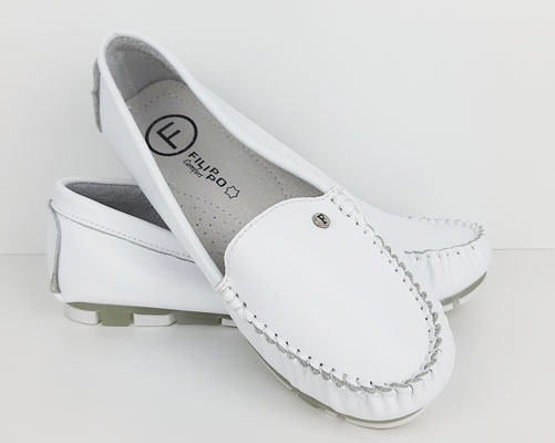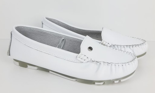 Obuwie wykonane z naturalnej skóry licowej w kolorze białym, świetnie dopasowuje się do stóp. Niezwykle miękkie - sprawiają wygodę i komfort w częstym, codziennym użytkowaniu. Wygodny, elastyczny spód - pod piętą ok. 1,5 cm, a przy tym bardzo lekki. Na przodzie delikatna srebrny nit.