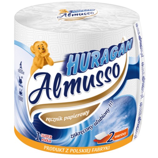 Ręcznik papierowy Almusso Huragan wchłania domowe kłopoty! Dwu-warstwowy ręcznik wykonany z śnieżnobiałej celulozy, ze specjalnej mieszanki włókien.