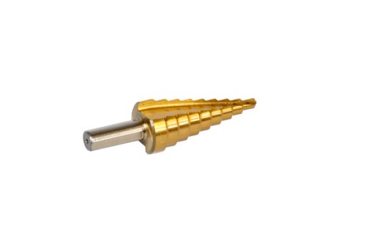Wiertło stopniowe ze stali HSS powlekanej warstwą tytanu. Pozwala na wiercenie idealnie okrągłych otworów w stali, mosiądzu, miedzi, aluminium, drewnie i tworzywie sztucznym.