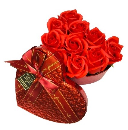 PACHNĄCE KWIATY MYDLANE W PUDEŁKU - RÓŻE CZEROWNE W PUDEŁKU o kształcie SERCE