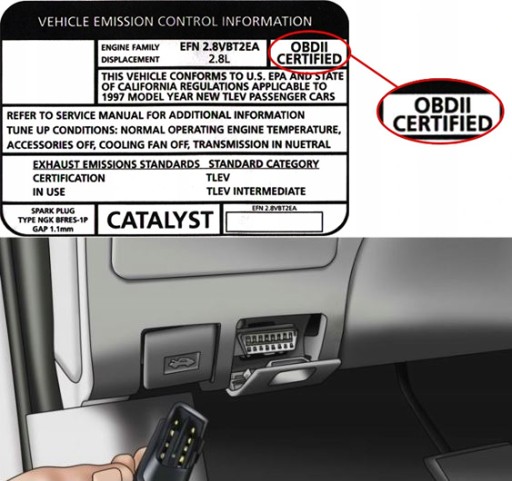 - powinny posiadać naklejkę informującą o emisji spalin, którą najczęściej umieszcza się w większości pojazdów pod maską lub przy chłodnicy. Naklejka ta posiada informację, czy dany pojazd ma certyfikat OBDII.