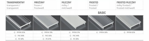 - Mleczny - biała przesłonka - wnętrze profilu jest niewidoczne, bardzo dobrze rozprasza punkty świetlne