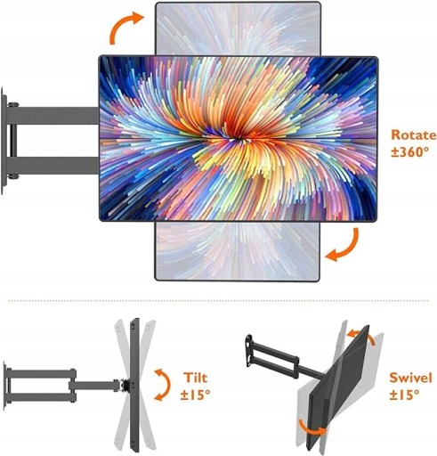 - Rozszerzony system przegubowy: Obrót szerokokątny od -180° do +180° spełnia różne potrzeby podczas oglądania; rozciąga się do 38 cm od ściany i cofa się do 4,75 cm, aby zaoszczędzić miejsce