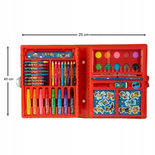 • Zawartość: farby 10 kol., 8 kredek, 8 kredek świecowych, 8 flamastrów, 10 naklejek, linijka, ołówek HB, temperówka, gumka, gąbka, pędzelek