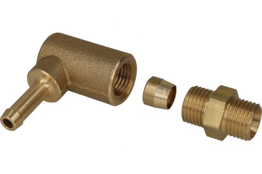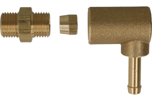 Kompletna złączka do podłączenia igielitowej dyszy przedłużanej, z możliwością podłączenia gumowego przewodu gazowego o średnicy 5 milimetrów pod kątem 90 stopni do otworu w kolektorze ssącym.W komplecie nypel do wkręcenia w kolektor ssący z gwintem M10x1 milimetr, pierścień zaciskający przewód igielitowy oraz kolano do podłączenia gumowego przewodu gazowego.