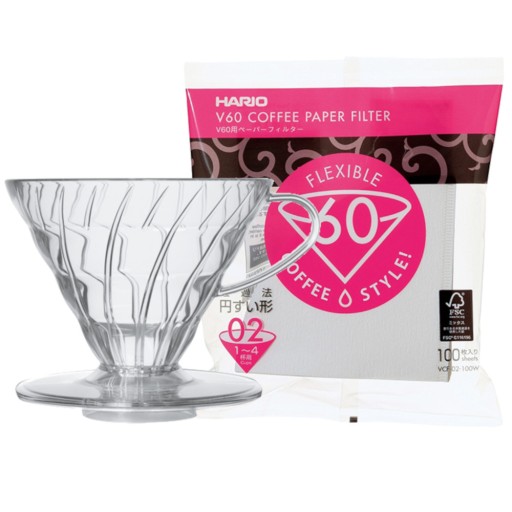 HARIO ПЛАСТИКОВЫЕ КАПЕЛЬНЫЕ ПРОЗРАЧНЫЕ V60-02 + БЕЛЫЕ БУМАЖНЫЕ ФИЛЬТРЫ 100 шт.