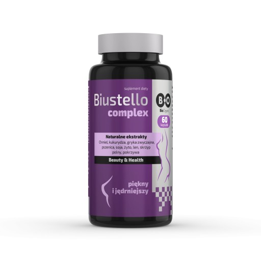 Biustello Complex jest innowacyjnym suplementem diety zaprojektowanym specjalnie do pielęgnacji biustu, łącząc siłę naturalnych składników dla wspierania jego piękna i zdrowia. Unikalna kompozycja produktu, bogata w fitoestrogeny pochodzące z chmielu, naturalnie przyczynia się do powiększenia i ujędrnienia biustu. Formuła Biustello Complex zawiera też mieszankę odżywczych składników roślinnych, w tym znamiona kukurydzy, nasiona gryki oraz ekstrakty z nasion pszenicy, soi, żyta, lnu i liści pokrzywy, które wspomagają zdrowie i wygląd skóry w okolicach biustu. Dodatek L-leucyny w formule poprawia elastyczność skóry i może wspierać wzmacnianie tkanki mięśniowej, zapewniając kompleksową pielęgnację i wsparcie dla biustu.
