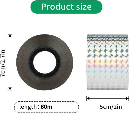 - 【Otrzymujesz 】 1 rolkę taśmy odstraszającej ptaki, długość całkowita: ok 60 m, szerokość: ok. 5 cm.