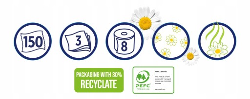 Velvet Rumianek i Aloes, 150 listków, 3 warstwy, 10 rolek – higiena i dekoracja inspirowana naturą.