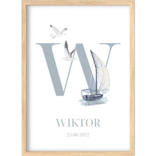 Piękne plakaty w delikatnych, stonowanych barwach bieli, błękitów i szarości przedstawiające żaglówki oraz pierwszą literę imienia, imię oraz datę urodzenia. Urządzanie pokoju dziecka to trudne wyzwanie. Warto ocieplić klimat wnętrza dodatkami takimi jak plakaty i nie pozostawiać pustych ścian. Śliczne grafiki idealne sprawdzą się w pokoju maluszka i doskonale wpasują się w każdy wystrój.