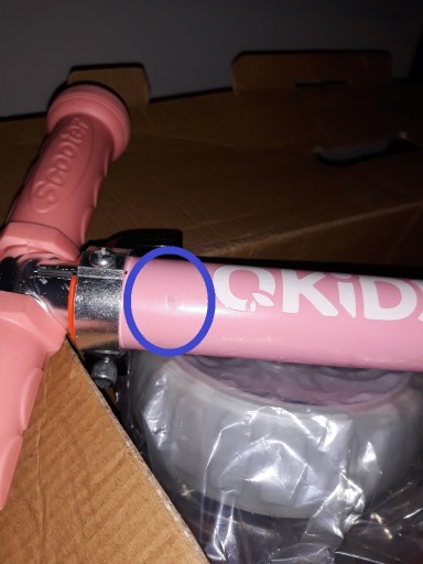 OUTLET - hulajnoga posiada drobne wady produkcyjne (oznaczone na zdjęciach niżej). Uszkodzony jeden z elementów - nie ma wpływu na prawidłowe działanie / montaż (zdjęcie obok). Opakowanie w stanie jak na zdjęciu.