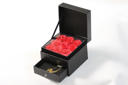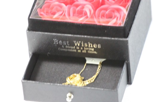 Pudełko z różami wykonanymi z pianki przez rzemieślników, z ponad 30-letnim doświadczenie w tworzeniu ręcznym. Dodatkowo do zestawu dołączony jest piękny naszyjnik. Umieszczony w szkatułce wygląda szykownie i elegancko. To doskonały sposób, aby okazać uczucia bliskiej osobie.