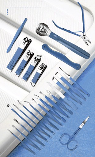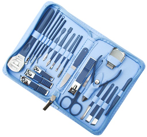 22-elementowy zestaw do manicure w eleganckim etui. Przybory bardzo solidne i wytrzymałe naostrzone i gotowe do użytku. Nowoczesne i oryginalne wzornictwo.
